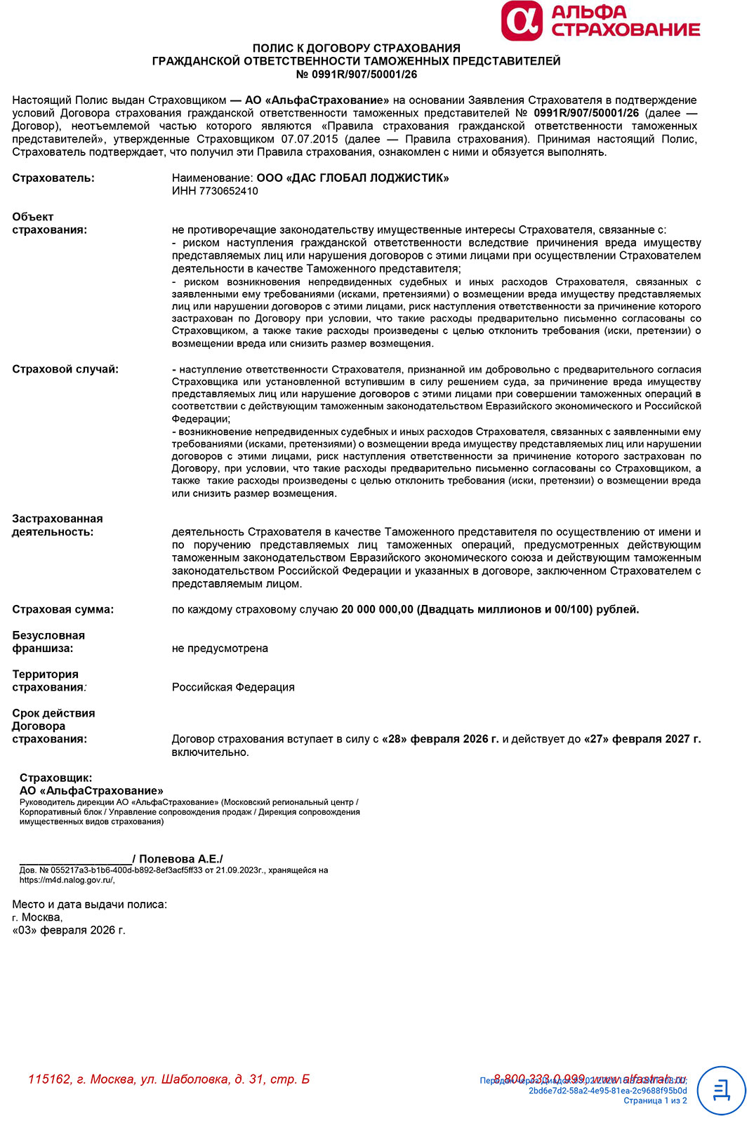 - Страховой полис (АО «АльфаСтрахование») № № 0991R/907/50001/26 от 28 Февраля 2026 г. – страхование гражданской ответственности при осуществлении деятельности таможенных представителей.